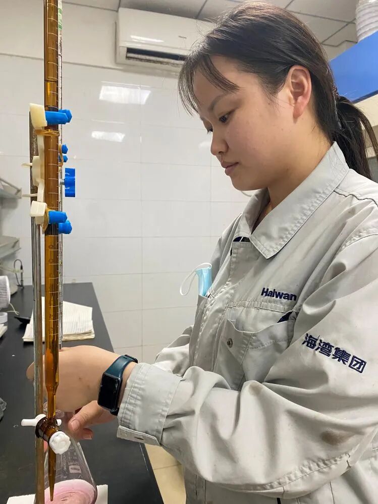 推开化验室的门,明亮的灯光下,王甜正俯身操作台,在专注地测定样品中的游离酸与氯离子含量。只见她左手稳稳扶住滴定管,右手轻晃锥形瓶,瓶内溶液的颜色变化被她紧紧锁在视线里——一滴、两滴,每一次滴加都精准控制,每一个动作都沉稳有序。她心里清楚,这重复的操作不是机械流程,而是产品合格的“第一道防线”,更是平稳生产的关键。