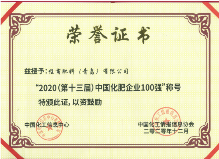 12月18日,由中国化工信息中心与中国化工情报信息协会主办的“2020第十三届中国化肥百强评选发布暨中国化肥产业可持续发展高峰论坛”上,碱业发展住商肥料获得“2020中国肥料企业100强”荣誉称号。