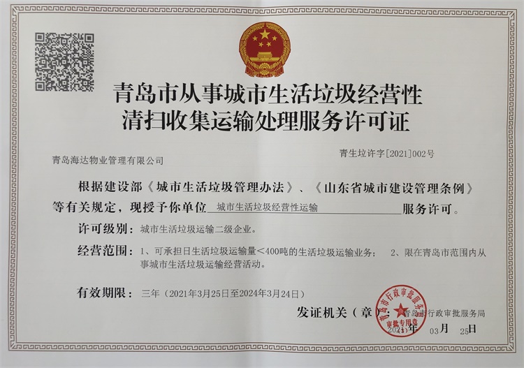 3月26日,海达物业顺利取获得行政审批局颁发的《城市生活垃圾经营性运输二级服务许可》。